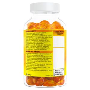 Per 2 Gummies % NRV Vitamin A 200 µg Re 25 % Vitamin C 160 mg 200 % Vitamin D 26 µg 520 % Vitamin E 8 mg – Te 67 % Vitamin B6 1.4 mg 100 % Biotin (B7) 100 µg 200 % Vitamin B12 5 µg 200 % Zinc 5 mg 50 % NRV = Nutrient reference value RE = Retinol Equivalent a-TE 14 = Alpha Tocopherol equivalent kcal per 2 gummies - Ingredients