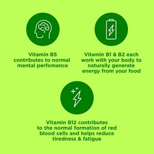 Table of Vitamins and Minerals Information Per tablet % NRV Vitamin B1 12mg 1091% Vitamin B2 15mg 1071% Niacin (B3) 50mgNE 313% Vitamin B6 8.2mg 586% Folic Acid (B9) 400µg 200% Vitamin B12 10µg 400% Biotin (B7) 150µg 300% Pantothenic Acid (B5) 23mg 383% Vitamin C 500mg 625% Magnesium 100mg 27% Zinc 10mg 100% Calcium 100mg 13% NRV = Nutrient Reference Value
