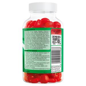 Per 2 Gummies % NRV Vitamin B1 0.26 mg 24 Vitamin B2 0.26 mg 24 Niacin (B3) 16 mg NE 100 Vitamin B6 1.4 mg 100 Biotin (B7) 100 µg 200 Vitamin B12 5 µg 200 Vitamin A 120 µg RE 15 Vitamin C 160 mg 200 Vitamin D 3.8 µg 76 Vitamin E 8 mg α-TE 67 NRV = Nutrient Reference Value α-TE = Alpha Tocopherol equivalent 14 kcal per 2 gummies RE = Retinol Equivalent NE = Niacin Equivalent - Ingredients