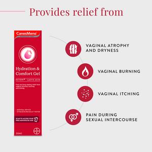 Canesmeno™ Hydration & Comfort Gel contains Ectoin® for fast relief from vaginal atrophy symptoms such as dryness, burning, and itching with long-lasting effect for up to 5 days.