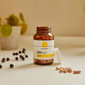 Food supplement capsules with CBD, Vitamin D3, Vitamin C, Zinc and Elderberry.