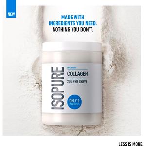 NEW ISOPURE® COLLAGEN We know nutrition can be overwhelming, so our products designed to keep things simple. Our Isopure unflavoured collagen is made with ingredients you need, and nothing you don’t. Because when it comes to looking and feeling your best, less is more. Made with just 2 ingredients, each serving provides 20g of quality Type 1 collagen and vitamin C to support healthy skin and joints*. With an unflavoured taste, no artificial flavours or sweeteners**, and free from sugar and fat, it’s a convenient and versatile way to add collagen effortlessly into your lifestyle without the unnecessary extras. MIX & BLEND WITH ISOPURE® Mix with other drinks such as coffee, blend into smoothies, or add to protein powders for a simple way to enjoy. However you take it, Isopure Collagen fits effortlessly into your lifestyle. We love adding a scoop to our morning coffee to start the day. To be used in the framework of a varied and balanced diet and a healthy lifestyle. Directions: Mix 20 g (~2 level scoops) with 200 ml of water and shake until dissolved. Mix: Add to other drinks, such as coffee. Blend: Add to smoothies. *Vitamin C contributes to the normal collagen formation for the normal function of cartilage and skin **Contains Steviol Glycosides from Stevia, with no artificial sweeteners